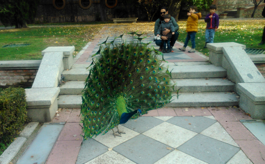 En los jardines de Cecilio Rodríguez (El Retiro) un pavo real posa para sus admiradores.