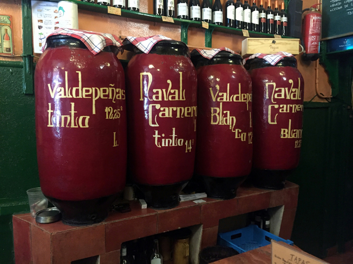Se conservan las pequeñas tinajas donde se servía el vino, recios y aromáticos tintos de Navalcarnero y de Extremadura que se guardaban en las tinajas, hasta que, en el año 2000, se prohibió la venta de vino a granel.
