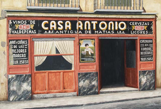 Es un homenaje a una de mis tabernas favoritas, Casa Antonio, en Latoneros, junto a Puerta Cerrada, cuya fachada fue desmantelada hace poco. Quise pintarla con el aspecto mágico y misterioso que tenía cuando la conocí.