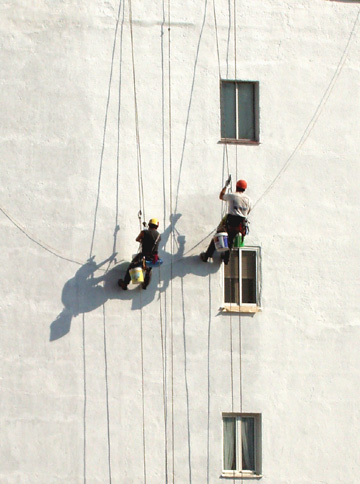 Los veo y no puedo evitar sentir un cierto vértigo, aunque, dicen que no por estar colgados tienen más riesgo que en los andamios normales. Antes no se usaban en Madrid los trabajos en altura; pero, a raiz del boom inmobiliario (qué curioso que se llamase boom desde mucho antes de que explotase) los andamios tradicionales adquirieron precios abusivos, y fue cuando llegaron los obreros colgados. Fue en los años noventa cuando empezó a vérseles haciendo el Spiderman en las medianerías. Al parecer, los primeros en descolgarse fueron trabajadores venezolanos, acostumbrados a trabajos verticales en su país.