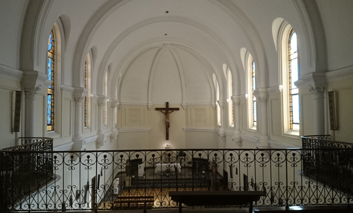 La capilla, de tipo historicista, con influencias neorrománicas, es diáfana y luminosa.