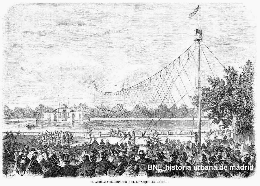 En 1863, el acróbata francés Charles Blondin sorprendió a los madrileños con su exhibición de funambulismo sobre el lago del Retiro.