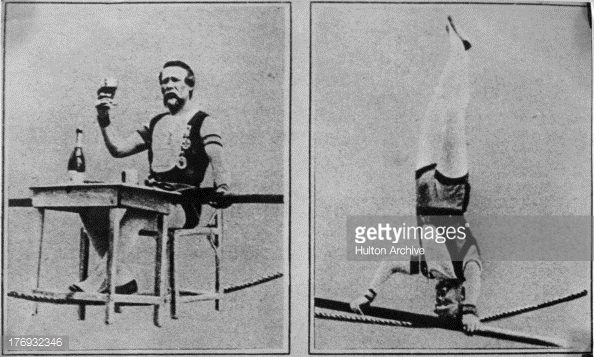 Blondin tenía otro número llamativo que era sentarse a merendar con mesa y silla incluidas en el centro de la cuerda floja.