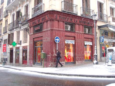 En la plazuela de Herradores, junto a la calle Mayor, nos topamos con estas bonitas fachadas de dos comercios que aquí hubo: La carnicería «El Arca de Noé» (un nombre un poco irónico tratándose de una carnicería) y «El barco de la Abundancia», sugestivo nombre de un ultramarinos de 1870. Hoy ocupa estos locales la centenaria tienda de paños: «Fieltros Olleros» fundada a mediados del XIX en la calle Mayor.
