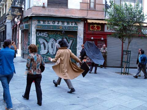 En realidad era un mimo que iba a su trabajo, pero me pareció la viva imagen del ciudadano madrileño de nuestros días: siempre apresurado; tanto, que dan ganas de preguntarse: ¿no es un poco ridículo vivir con tantas prisas?