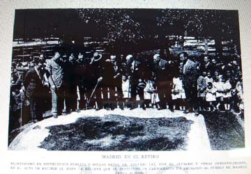 Esta foto del diario ABC del año 1929 muestra el acto de inauguración del precioso mapa en relieve de España que fue instalado en el parque del Retiro, en el espacio comprendido entre la Rosaleda y el Paseo de Coches.