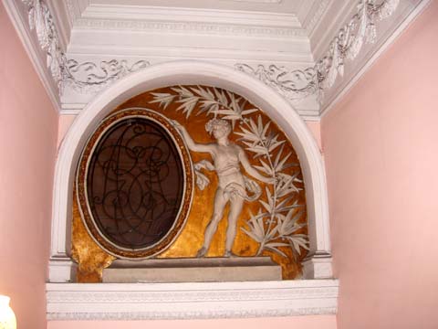 El salón es de estilo restauración, con influencias del neorrococó y con pinturas pompeyanas firmadas por el decorador.