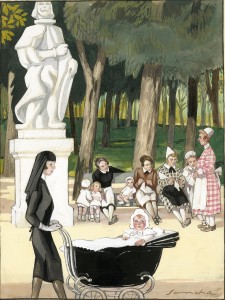 Cuidando a los niños en el parque (puede ser la Plaza de Oriente o más bien el paseo de las estatuas del Retiro)
