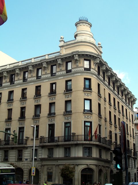 Pasa por ser el primer edificio construido en la vía. Decorado con motivos del arte romano, como la loba capitolina que coronaba el torreón. A fines de los años cuarenta dejó de ser hotel para ser ocupado por un banco. Hoy radica en él la Consejería de Justicia de la Comunidad de Madrid.