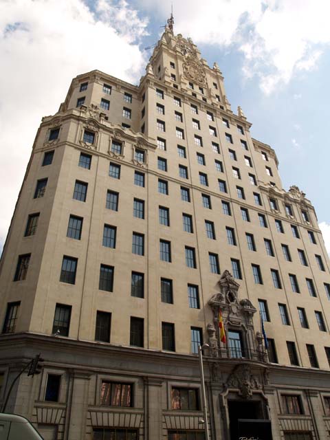 -El estilo arquitectónico parte de la inspiración neoyorkina y añade elementos barrocos madrileños. Tiene una estructura metálica hormigonada. Fue levantado en tiempo récord: de marzo a octubre de 1927, gracias a potentes grúas.