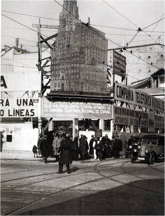 -En este solar se iban a construir los Grandes Almacenes Victoria, pero pensaron que era mejor negocio especular con el terreno. En poco tiempo pasó a valer el doble y entonces lo compró La Telefónica para hacer su sede principal. Querían que fuera el rascacielos más alto de europa y que estuviera en la calle más importante. La compañía, que ya era una de las más pujantes del país, tenía 12.000 abonados. El cableado telefónico, que iba por las azoteas de los edificios empieza en esta época a canalizarse.