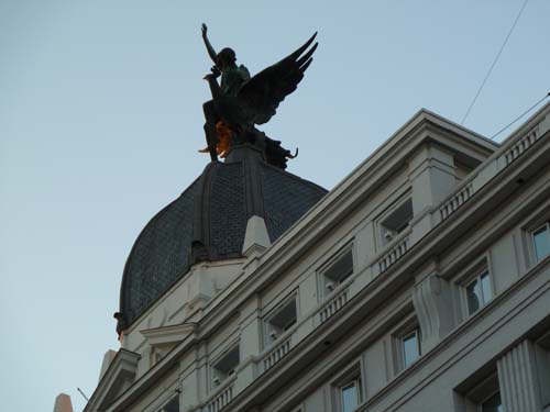 Gran Vía, 32. Edificio construido por los arquitectos Teodoro de Anasagasti y Maximiliano Jacobson en 1922. Se hizo para los grandes almacenes Madrid-París, uno de los primeros grandes almacenes de Madrid. Había zonas de venta distribuidas por pisos en torno a un patio central cubierto. Contaba con dos cúpulas laterales que servían como depósitos de agua y una gran cúpula central de 30 metros de diámetro que iluminaba el patio central en torno al cual se situaban laos puntos de venta. Los almacenes Madrid-París fracasaron a los pocos años, quizás por su planteamiento elitista, y en 1934 el edificio fue reformado, construyéndose tres plantas más y un cine, el Imperial. Se eliminaron las graciosas cúpulas que lo flanqueaban y se colocó una estatua del ave Fénix. Se instalaron entonces los almacenes SEPU (Sociedad española de precios únicos) con un sistema de ventas de precios fijos y accesibles a todos los bolsillos. Sistema que imitaba el que se inició en 1879 en Nueva York por el empresario Woolworth. SEPU permaneció hasta el 2002.