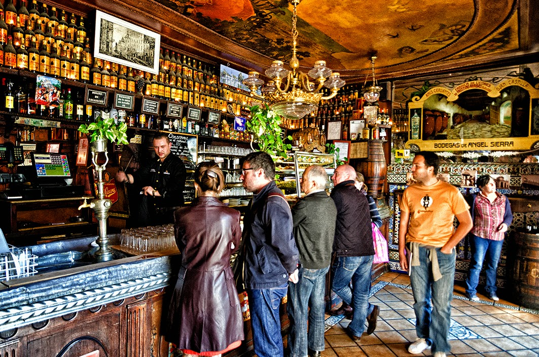 La taberna de Ángel Sierra, fundada en 1917 en la plaza de Chueca, es una de las tascas más bonitas de Madrid. Su decoración reúne lo mejor de los oficios artísticos: ebanistería, bronce, azulejería, pinturas tras cristal, murales en techos y paredes…