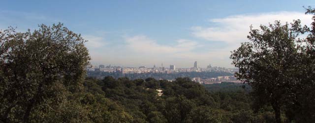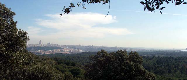 Madrid. Su línea del cielo al completo desde el cerro de Garabitas, en la Casa de Campo. Al norte, Aravaca, Pozuelo y la sierra.