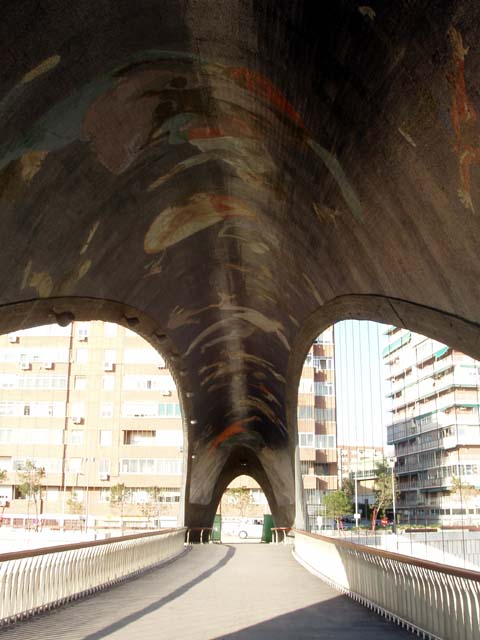Además de la pasarela de Perrault, al paseante le llaman la atención otros dos puentes con forma de bóveda que unen el antiguo matadero con la otra orilla del Manzanares. El autor es Hugo Corres, quien ha contado con varios artistas para realizar los espléndidos murales de gresite, cuyas pequeñas teselas coloreadas reproducen a gentes diversas vistas desde abajo.